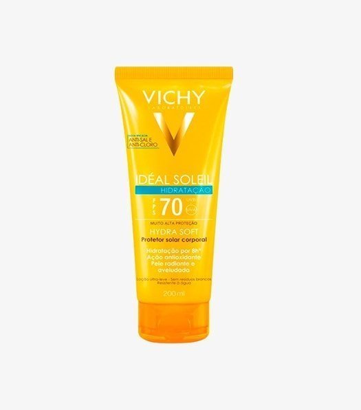 Protetor solar corporal para todos os tipos de pele. Vichy Ideal Soleil Hidra Soft FPS70 Protetor Solar com textura leve e de rápida absorção que hidrata a pele intensamente por até 8 horas.